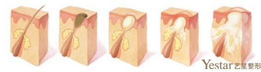 皮脂腺分泌过多油脂 油脂累积堵塞毛孔 细菌、螨虫滋生 毛囊感染发炎、红肿 形成痘痘